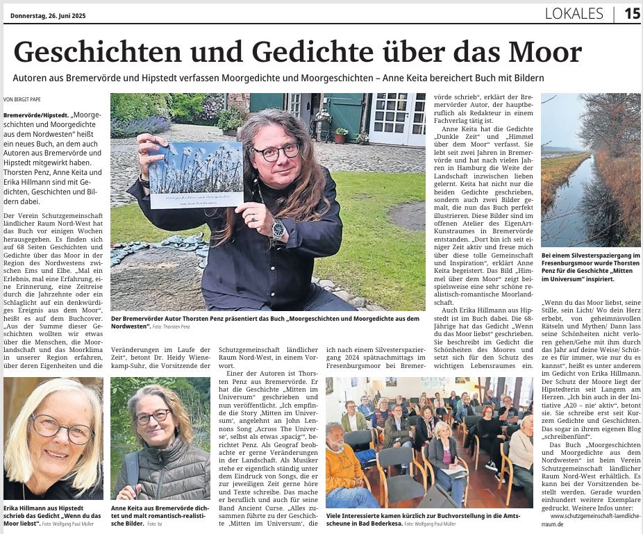 Der Literaturwettbewerb der Schutzgemeinschaft Ländlicher Raum Nord-West e.V. zum Thema Moorgeschichten ist beendet und die Jury hat ihr Arbeit abgeschlossen. Nun sollen mit einer Lesung die Ergebnisse vorgestellt werden. Die erste Lesung fand vergangene Woche in Westerstede statt. In Bad Bederkesa gibt es nun eine weitere Chance, sich in die Gedankenwelt der Autoren entführen zu lassen.